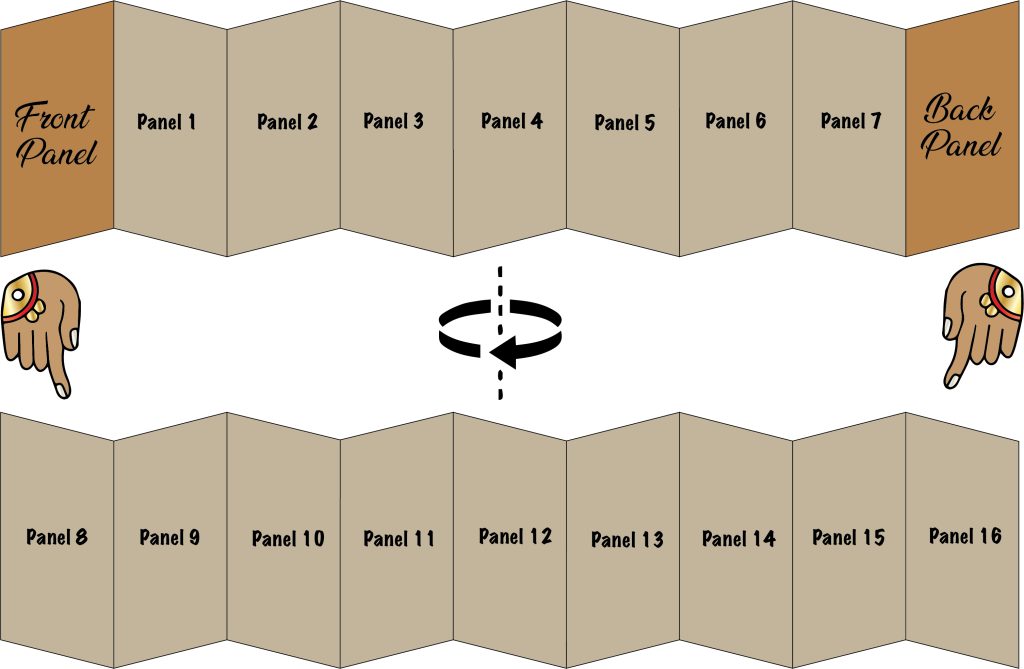 These manuscripts were not read linearly like modern books—they were consulted section by section. When unfolded, their length can reach several feet. Both sides of the folded manuscript were painted with individual panels. (Figure 5) Each panel was generally read from left to right, top to bottom. But since the Maya codices are not purely textual, the panels were often framed into sections using a red pigment to mark the narrative flow. (Figure 6)