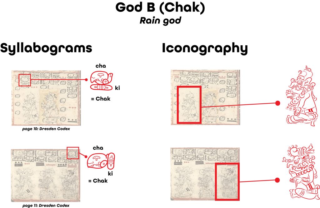 Since the Maya recorded their culture using glyphs, their writing appeared in various forms, and the codices were no exception. They incorporated the use of syllable glyphs (the combination of phonetic sounds) and logograms (glyphs that represent a word or concept). The use of iconography was also common to help depict “deities” in the Maya codices. (Figure 7)  What distinguishes the glyphs found in the codices from those carved into stone is the use of fine brushes, typically made from animal hair or plant fibers. This allowed scribes more freedom, allowing them to stylize the glyphs, which gave the glyphs a calligraphic appearance. This form of glyph style is known as “Codical style”. It is often written in black and red ink and commonly found in abbreviated forms. This style is also found in ceramics from the Late Classic period.