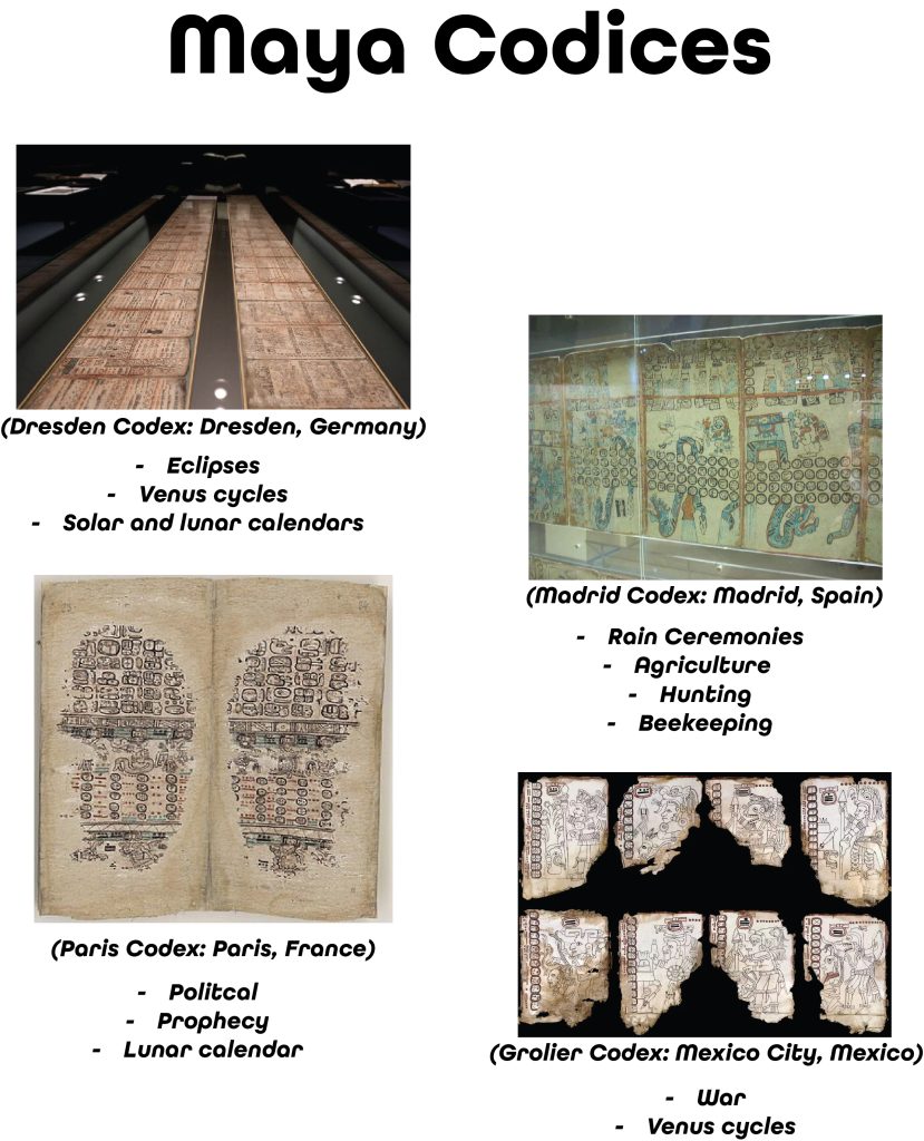 Each page is organized into almanacs and tables. (Figure 2) They demonstrate how the Maya once used sophisticated calendric cycles to predict celestial movements and coordinate ritual ceremonies. Each codex served its purpose. Some were used to track various planets/stars, and others were used to predict agricultural events or social/ritual activities. These codices served as an instrument for priests, day-keepers, and only the noble class had access to them. Evidence shows that several scribes were involved in creating these codices because the technique used with glyphs varies throughout each codex.